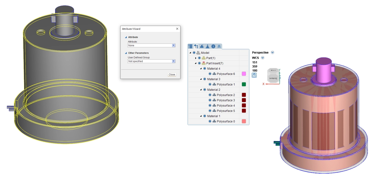 Double-click the polysurface to open the attribute setting and set the outermost polysurface as Part. Select other polysurfaces, click Attribute in the Model Tab, designate them as Part Insert, and click Close to complete the setting.