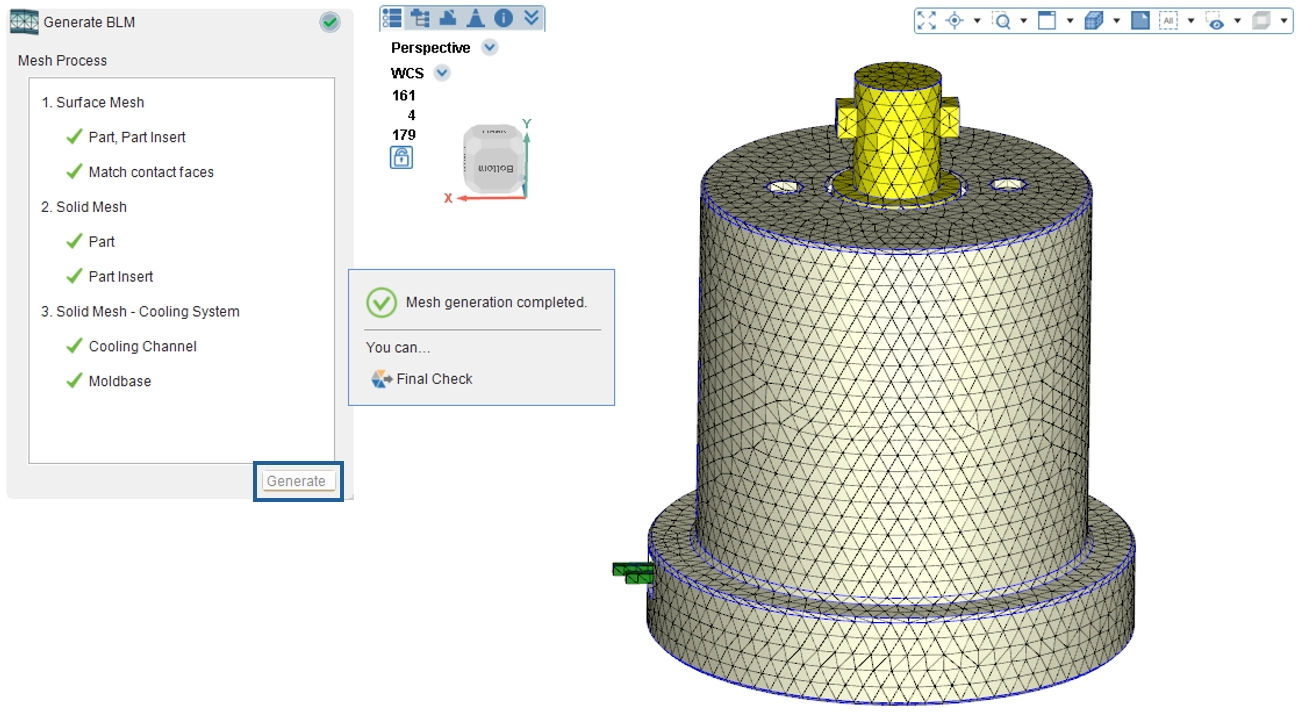 Return to the Mesh Tab and click Generate. Click the Generate button in the wizard to continue mesh generation. When all mesh items are complete and the Final Check button appears, click Final Check to save the mesh file.