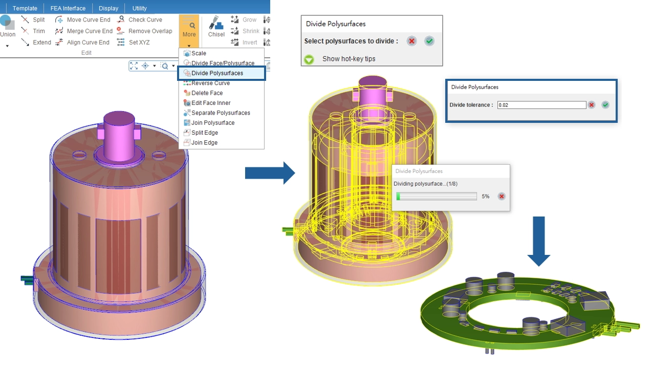 - Do not need to repeatedly execute the Divide Face/Polysurface function regarding different target geometries.