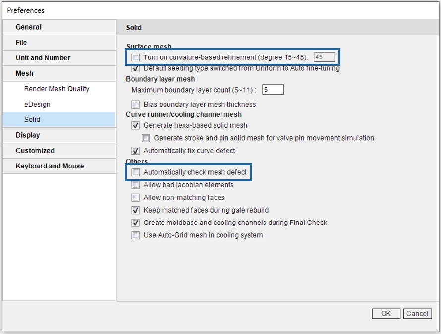 - If the mesh count is high, it is NOT recommended to check “Automatically check mesh defect” so as to prevent automated updates to defect tree during mesh fixing.