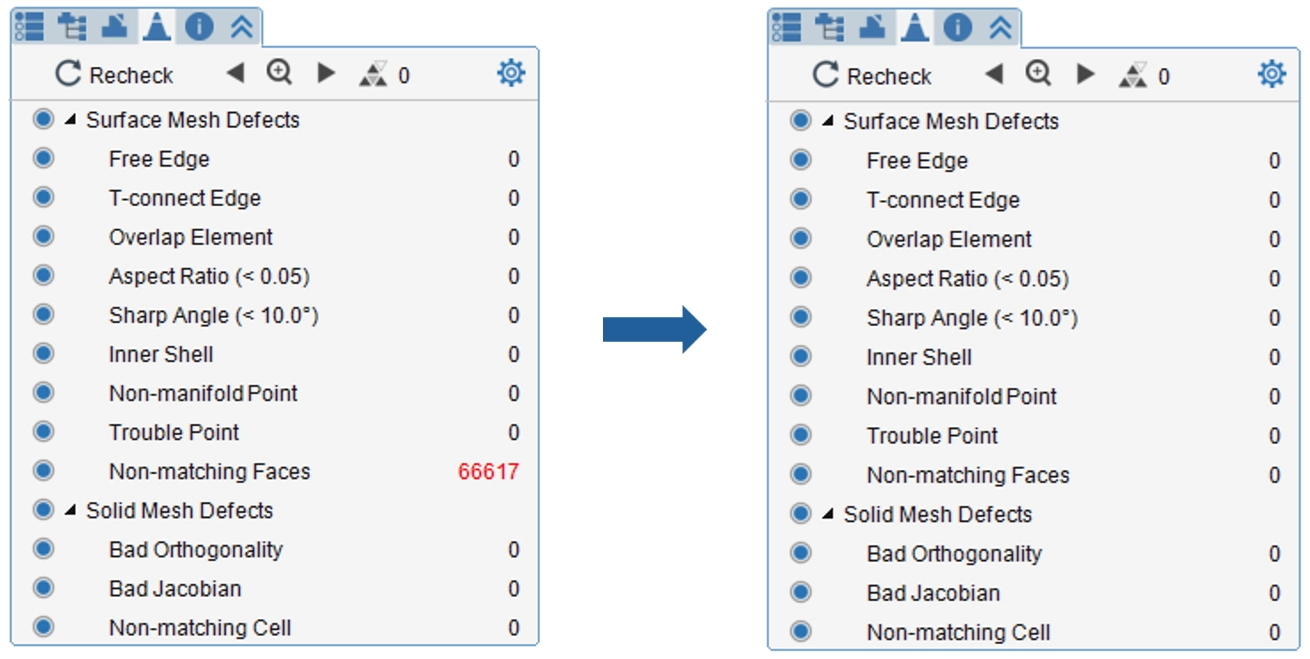 Recheck surface mesh defects. The faces are successfully matched when the Non-matching Faces error count is zero.