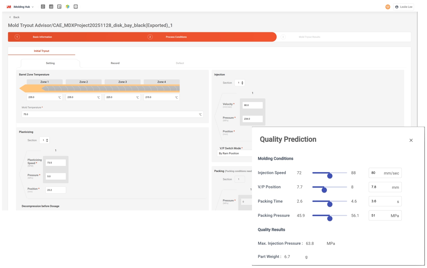 Following the mold tryout, users can utilize iMolding Hub to record machine response data, actual molding results, and defects (such as short shots, warpage, air traps, or flash.) The system performs a gap analysis against previous predictions, automatically calibrating the quality prediction model within iMolding Hub and updating subsequent parameter recommendations.