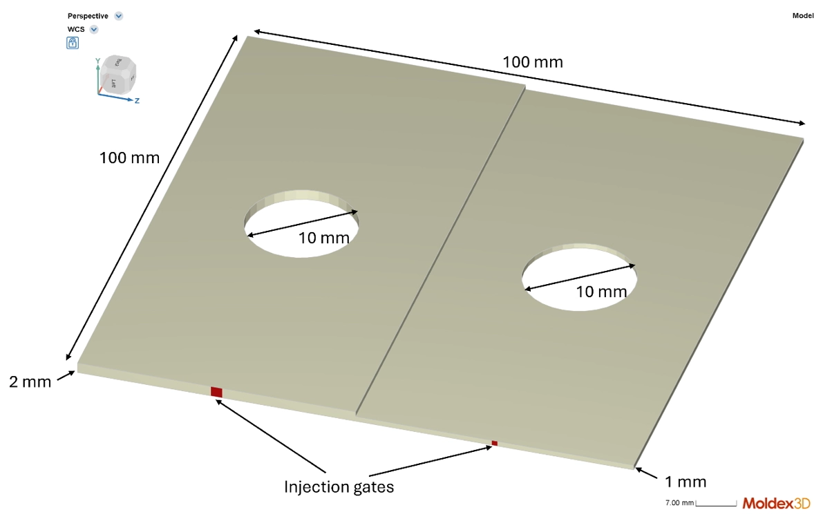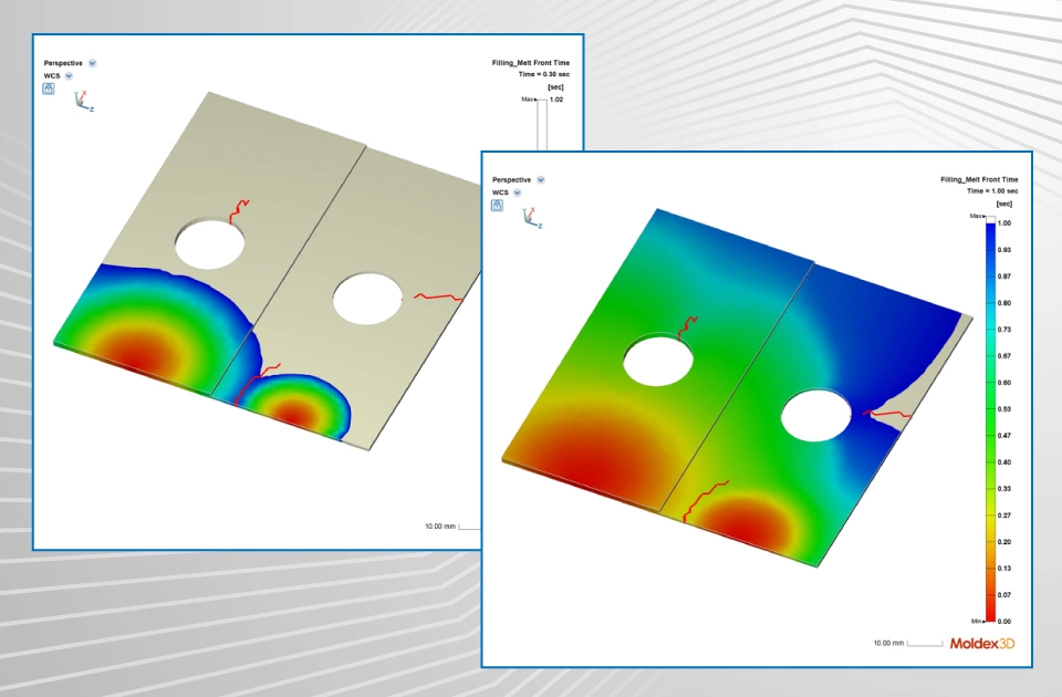 Injection molding is a key process for manufacturing high-precision plastic parts. However, during the molding process, weld lines often form at convergence points of two melt fronts (as shown in Fig. 1), resulting in reduced product strength and surface defects. Moldex3D 2026 introduces comprehensive enhancements to the weld line prediction system, including optimized algorithms and an improved interface. The latest version also features real-time interactive parameter adjustment and provides dynamic calculation analysis.