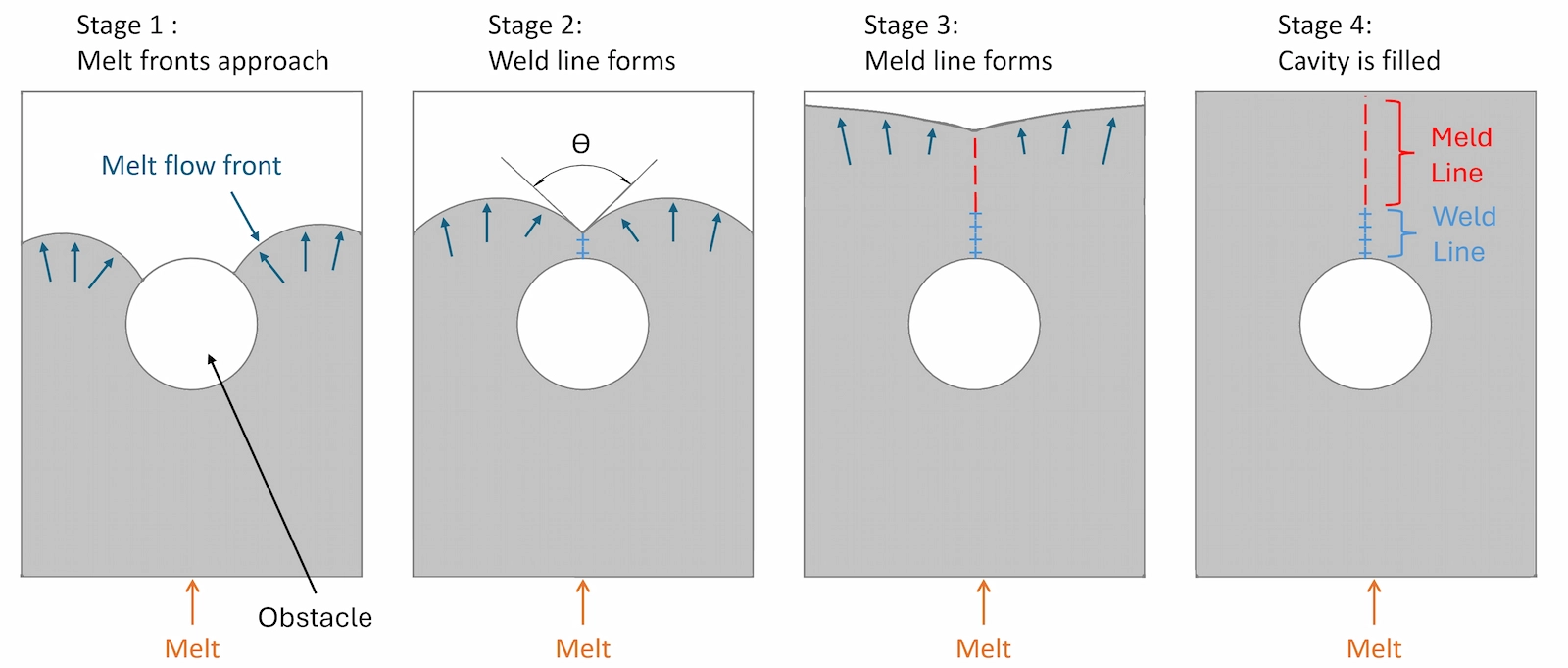 In Moldex3D’s flow analysis, weld lines are detected by measuring the meeting angle between two molten plastic flow fronts. As shown in Fig. 2, θ denotes the angle, which is crucial for categorizing weld line types and evaluating their quality. If the meeting angle θ is below 145°, a sharp weld line forms, often resulting in weak bonding and decreased mechanical strength. When θ exceeds 145°, a meld line appears, featuring improved fusion and stronger mechanical properties. Moldex3D sets 145° as the standard cutoff to differentiate between the two.
