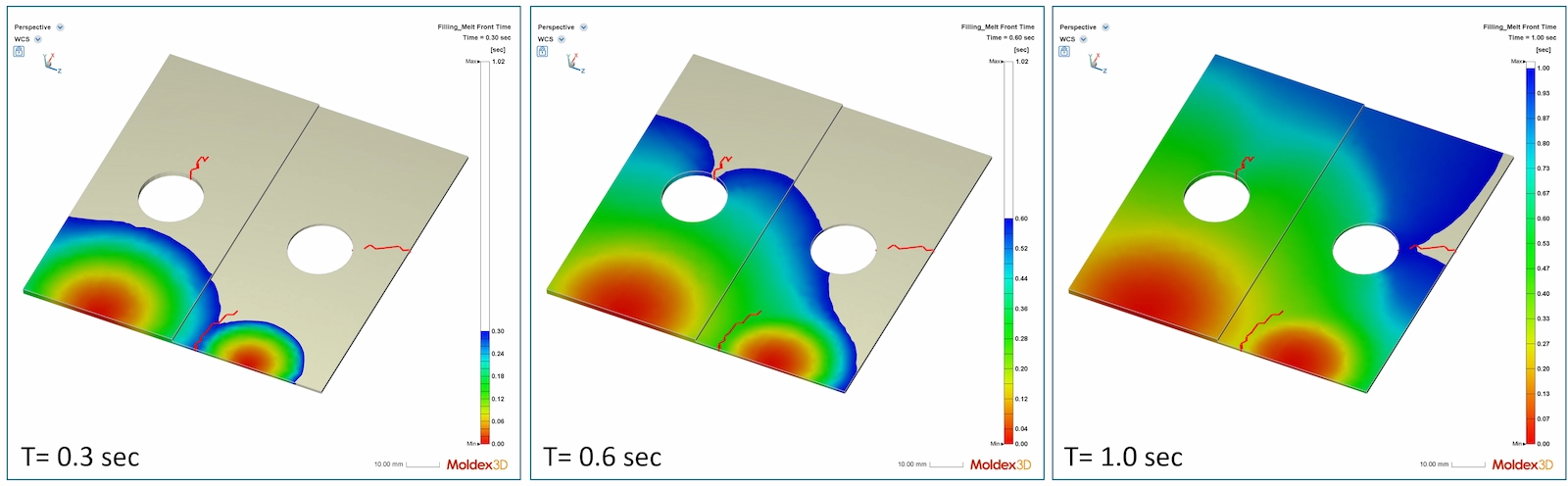 Moldex3D 2026 introduces a more refined weld line position prediction algorithm, enhancing the connection of the start and end of weld line transition segments. It dynamically tracks the fusion process of the two molten plastic flow fronts and consolidates potential weld line locations into a single continuous line segment. Fig. 4 illustrates the interaction between flow front and weld line formation across various flow stages. Users can better understand the root causes of weld line formation and optimize mold design & process parameters accordingly.
