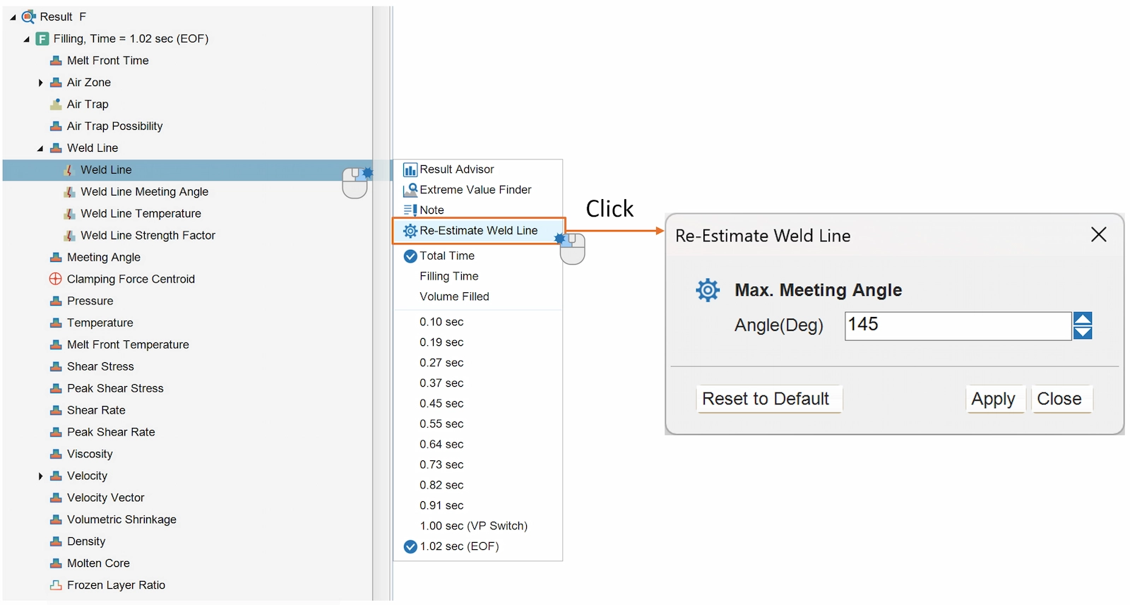 To improve usability, a real-time interactive interface has been added. Through “Re-Estimate Weld Line,” users can customize the maximum meeting angle and gain an instant update on weld line lengths, allowing for a rapid assessment of meld line regions and quality. Furthermore, the optimized theory has strengthened weld line strength prediction. It now incorporates critical, instantaneous physical parameters—such as temperature, pressure, and shear rate—to ensure results align more closely with real-world conditions. These comprehensive improvements equip users with reliable data to support detailed structural strength analyses and more effective design optimization.