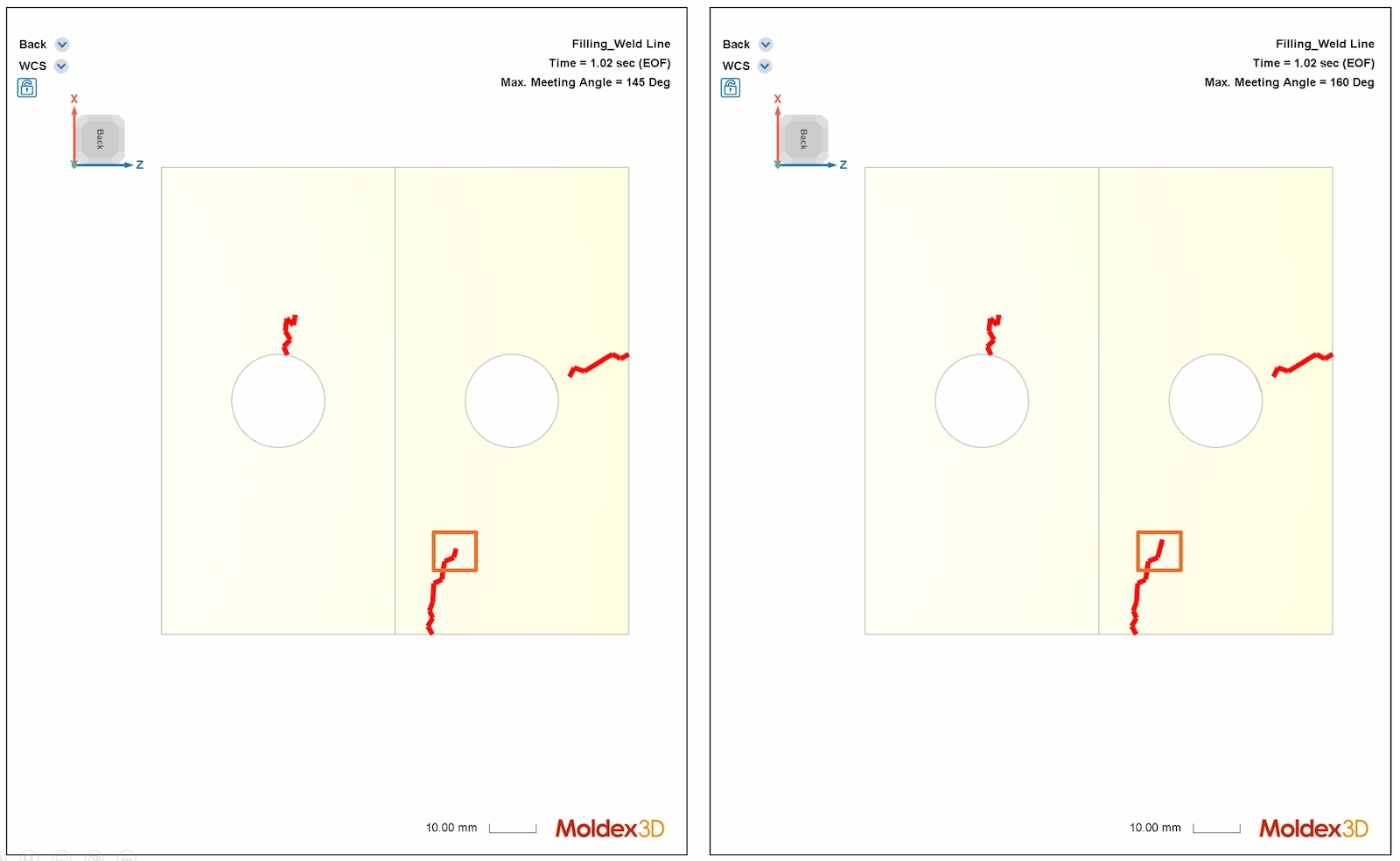 Fig. 6 The setting of Max. Meeting Angle affects weld line extension. (Left: 145°; Right: 160°)