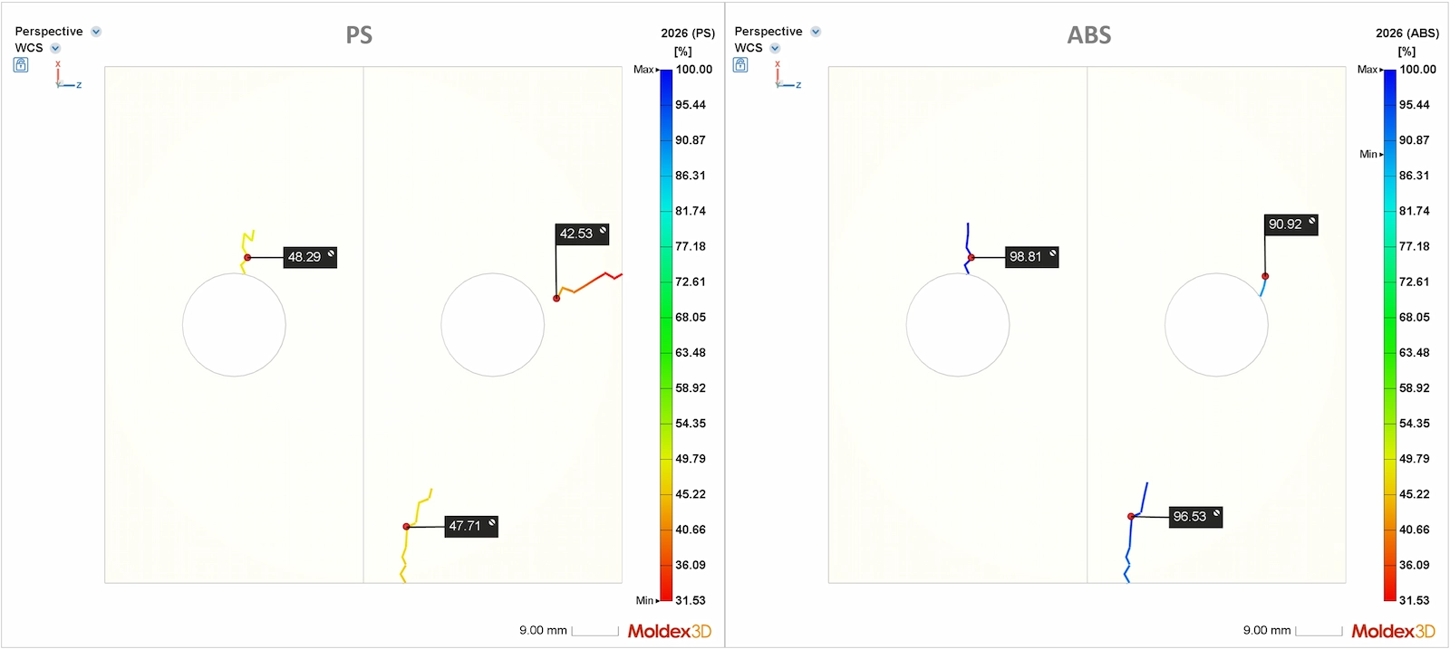 As shown in Fig. 7, further analysis of weld line strength across different materials reveals that, despite consistent processing parameters, materials impact both the flow front and weld line locations as well as the resulting weld line strength. This helps users understand the impact of various materials on weld line strength during product design, enabling more precise material selection.