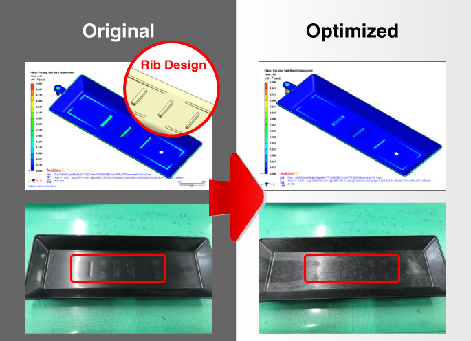 Main causes of sink marks and voids in plastic parts, emphasizing part thickness variation and uneven shrinkage. It suggests that the key to addressing these surface quality problems lies in improving mold design and modifying process settings. The proposed solutions include adjusting the cooling layout, gate location, and gate diameter in the mold design, as well as making process setting modifications such as increasing packing time, decreasing melt temperature, and increasing cooling time. These changes aim to reduce the occurrence of sink marks and voids.