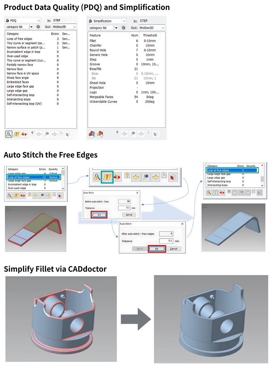 Moldex3D CADdoctor, được phát triển trong sự hợp tác giữa CoreTech (Moldex3D) và Elysium, là công cụ xử lý hình học giúp tự động hiệu chỉnh, đơn giản hóa và kiểm tra mô hình hình học.