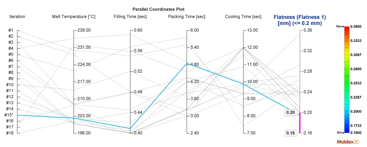 The upgraded DOE Wizard in Moldex3D 2026 supports design constraints, allowing engineers to consider quality targets and design limits simultaneously. Optimization results are more practical and aligned with real molding conditions.