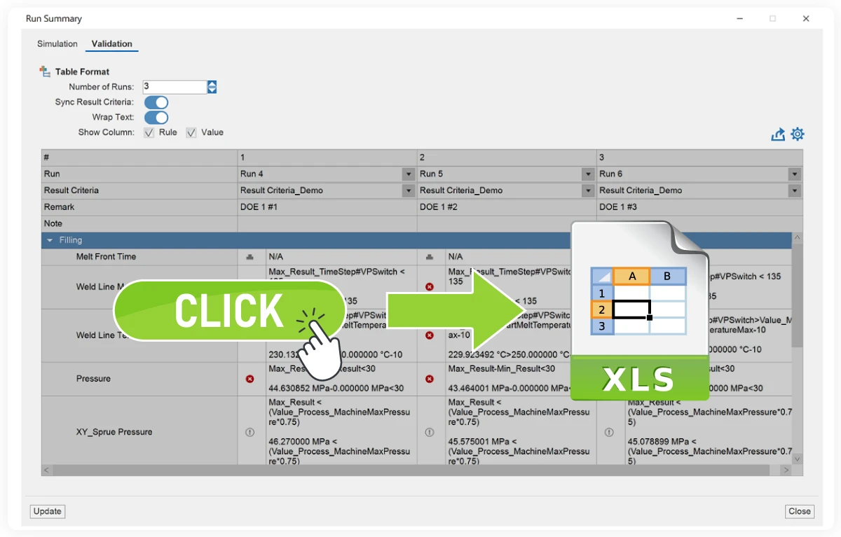 Moldex3D 2026 enhances result review and reporting with an upgraded Run Summary, supporting direct validation and one-click Excel/CSV export. Engineers can easily consolidate multiple simulations and track key quality metrics. Injection pressure, melt front progression, cooling performance, and many others are presented in structured reports, ensuring transparency and traceability. Teams can validate results and make decisions faster, with confidence grounded in reliable data.