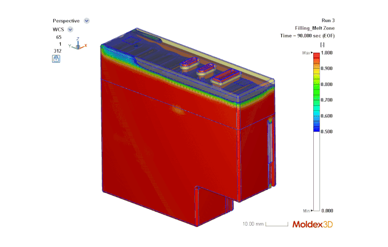 Moldex3D 2026 introduces Hybrid Zone equivalent modeling, reducing simulation time by approximately one-third while preserving key physical behavior and accurately capturing flow front evolution—enabling fast and reliable design iteration.